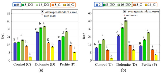 After the application of dolomite, the diminishment was 6.2 fold, and for perlite, it was 5.2-fold. The negative effect of G on maize was less substantial than that of DO. The highest dose of this product (16 g kg−1 of soil) decreased the aerial parts biomass by 3.8 fold, while after the application of dolomite, it was diminished by 1.9 fold, and for perlite, by 1.6-fold. The low values of the dolomite (D) and perlite (P) influence indices on the aerial parts biomass in the control treatments (Figure 1b) indicate that these sorbents when added to soil not degraded by petroleum products, did not exert a significant influence on the physiological processes of maize. However, relatively high values, especially in the DO_8 and G_16 treatments, suggest that the implementation of D and P partially mitigates the negative effects of DO and G on the plant.