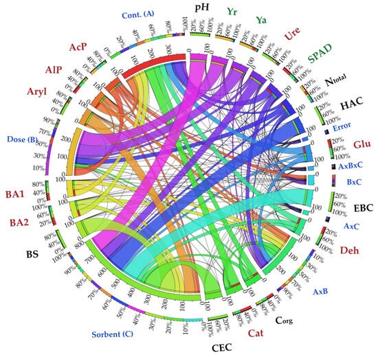 Among the three variables: type of petrochemical product (Cont. A), dose of petrochemical product (Dose B), and type of sorbent (Sorbent C), Cont. A predominantly influenced the activity of Cat, Glu, AlP, Deh, SPAD index, Corg content, and BA indices, while it had the least effect on the aerial parts and root biomass of Zea mays, soil pH, HAC, EBC, SEC, BS, AcP, and Ure activity (Figure 7). Dose B had the greatest effect on the Zea mays aerial parts and root biomass, AcP activity, and soil Ntotal. The third factor investigated, the type of sorbent (Sorbent C), was most significant in determining soil pH, HAC, EBC, CEC, BS, Aryl, and Ure activity.
