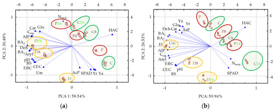 The activity of selected enzymes from the oxidoreductase and hydrolase classes was determined in the soil samples, both before the experiment setup and after its completion (Table 2). The concentration of the released product in the case of Deh, Ure, AcP, AlP, Aryl, and Glu was determined using a Perkin-Elmer Lambda 25 spectrophotometer (Waltham, MA, USA). In the air-dried soil, the content of total organic carbon and nitrogen was determined using a macroanalyzer Vario MaxCube CN (Hanau, Germany), soil pH in 1 mol KCl dm−3. An aqueous 0.5 M calcium acetate solution was used to determine hydrolytic acidity (HAC), and an aqueous 0.1 M hydrochloric acid solution was used to determine the sum of exchangeable base cations (EBC). The filtrates were titrated in the presence of phenolphthalein with an aqueous 0.1 M sodium hydroxide solution. The content of exchangeable cations (CEC) was calculated by summing the results of the HAC and EBC determinations, and then base cations saturation in soil (BS) was calculated according to the formula BS = EBC/CEC × 100%. A detailed description of these methods is given in our previous study [74]. All determinations were performed in 4 replications.