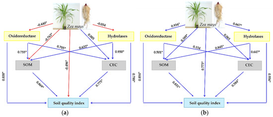 The influence of plants, soil enzymes, SOM, and CEC on soil quality contaminated with diesel oil (a) and gasoline (b). Blue arrows represent positive effects, while red arrows indicate negative effects. Numbers next to the arrows represent the magnitude of the dependency effect. *—statistically significant.