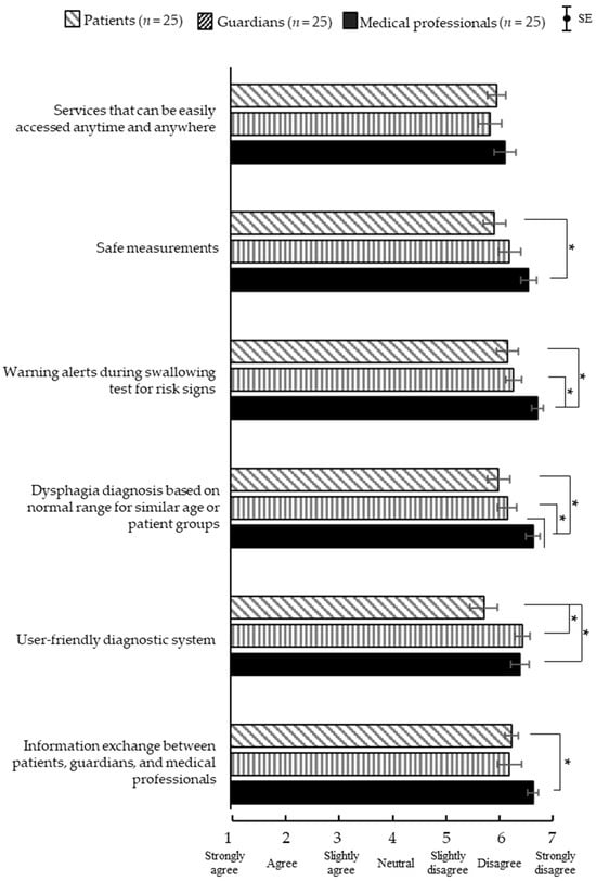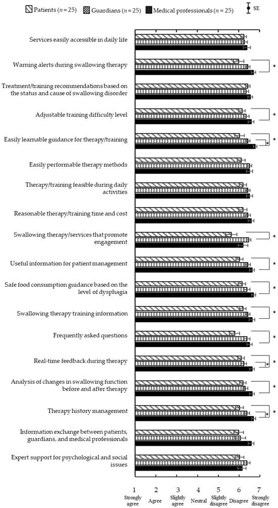 The analysis conducted for cross-group comparisons in the assessment of the importance of each swallowing healthcare requirement revealed significant differences in importance between stakeholder groups. For prevention/screening requirements, as shown in Figure 1, the importance ratings were significantly higher (p < 0.01) in the medical professional group (5.8–6.6) and the individuals at risk group (5.4–6.4) than the healthy senior group (2.7–4.4). Regarding evaluation/diagnosis requirements, as displayed in Figure 2, significant mean differences (p < 0.05) were identified in the items of safe testing, warning alerts during swallowing tests, dysphagia diagnosis norms, and easy use of the dysphagia diagnosis system. Further analysis revealed that the importance of providing safe tests, warning alerts during swallowing tests, and provision of diagnosis standards for dysphagia was higher among the medical professional group (6.0–6.7) than in the patient group (5.9–6.2). However, the importance of the easy use of the dysphagia diagnosis system was higher in the guardian group (6.4) and the medical professional group (6.4) than in the patient group (5.7). Lastly, for treatment/training requirements, as depicted in Figure 3, significant mean differences (p < 0.05) were identified in the items of warning alerts in case of danger, treatment/training information, patient management information, guidance on safe food intake by the level of dysphagia, frequently asked questions, real-time feedback, treatment/training record management, and incorporation of game elements. Detailed analysis showed that the importance of warning alerts in case of danger, treatment/training guidance, patient management information, safe food intake guidance by the level of dysphagia, frequently asked questions, real-time feedback, and treatment/training records were significantly higher in the medical professional group (6.2~3.8) than in the patient group (5.6~6.2). Regarding the incorporation of game elements, the guardian group (6.5) rated them higher than the patient group (5.6).