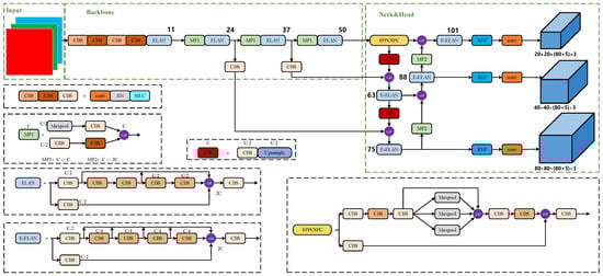 The YOLOv7 network structure, as shown in Figure 1, takes 640 × 640 three-channel RGB training images as input. It adopts the Mosaic data augmentation method proposed in YOLOv4, which involves randomly cropping four input images and then stitching them together to form a single training image. This enriches the dataset and enhances training efficiency. The backbone network consists mainly of efficient layer aggregation network (ELAN) modules and MP (MaxPool) modules. The ELAN modules are used for image feature extraction and channel control, while the MP modules maintain consistency in the number of channels before and after processing. The neck and detection head comprise the Spatial Pyramid Pooling, Cross-Stage Partial Channel (SPPCSPC) modules, extended ELAN (E-ELAN) modules, and MP2 modules. It adopts the same Path Aggregation Feature Pyramid Network (PAFPN) structure as YOLOv5 for aggregating features of multiple sizes. This structure forms large, medium, and small IDetect detection heads and decouples the feature information obtained from the neck. The RepVGG Block (REP) structure is used to adjust the number of channels in the decoupled feature information. Finally, the generated feature maps are predicted and output using 1 × 1 convolutions. Through the collaboration of these modules, the YOLOv7 network achieves excellent results in object detection tasks.
