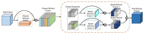 In order to more effectively utilize attention mechanisms, this paper employs a lightweight and efficient HAM [27] to enhance the model’s extraction and fusion of mask features. The HAM consists of channel attention and spatial attention modules, as illustrated in Figure 5. Firstly, the channel attention module generates channel attention maps and refined channel features. Then, the spatial attention module, based on the channel attention module, optimizes the channel features along the channel axis, dividing them into two groups and generating a pair of spatial attention descriptors. Finally, refined features are produced adaptively, emphasizing crucial regions based on these spatial attention descriptors.