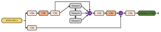 The spatial pyramid pooling (SPP) structure can transform feature maps of any size into fixed-size feature vectors, addressing the issues caused by varying input image sizes and simultaneously enhancing the accuracy of object detection. The SPPCSPC module integrates the advantages of spatial pyramid pooling and cross-stage partial networks, resulting in a significant performance improvement compared with SPP, albeit at the cost of increased parameters. This paper proposes improvements to the SPPCSPC structure by incorporating a Hybrid Attention Module-ResBlock_HAM at the output position and transforming the original three parallel Maxpool pooling layers into a sequential arrangement, as shown in Figure 6. Despite the introduction of hybrid attention increasing the parameter count, the use of max pooling can reduce the size of the feature layers. The sequential computation helps mitigate the increase in parameters and not only enable better capture of the target object features but also significantly improve the model convergence speed and, to some extent, mitigate overfitting.