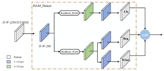 The HAM_Detect module initially takes the fused feature maps from three different scales into three corresponding scale prediction heads. The fused feature map undergoes a 1 × 1 convolution to adjust the channel count before being fed into both the classification and regression branches. In these two branches, a hybrid attention mechanism is employed to learn the weights and enhance the feature maps. Subsequently, a 3 × 3 convolution extracts high-dimensional features. The classification branch extracts texture information from the input feature map, the confidence regression branch captures background information, and the bounding box regression branch extracts positional information. Finally, a 1 × 1 convolution adjusts the channel count, and the results from each branch are concatenated through the CONCAT operation.