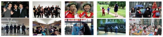 This paper is based on the publicly available AIZOO dataset. Additionally, Python web scraping techniques were employed to gather images of individuals wearing masks in various complex scenarios from the internet, expanding the dataset. After reorganization, the dataset consisted of over 10,000 images with diverse sizes, angles, and lighting conditions. The images were reannotated using LabelImg software to create a dataset specifically for scenarios involving mask wearing in complex scenes, including images from real-life situations such as stations, schools, hospitals, and malls. Some examples are shown in Figure 9. The dataset includes three classes: faces without masks (face), masks (mask), and faces with masks (face_mask). The dataset was split into training and testing sets at a 4:1 ratio.
