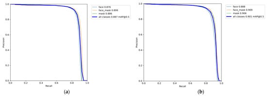For the “face” category annotated by the data in this paper, as an example, TP represents the number of face images without masks correctly detected as the “face” category after model training. FP is the number of images containing masks or faces with masks incorrectly detected as the “face” category. FN is the number of face images without masks incorrectly detected as either having masks or as faces with masks after model training. Precision (P) describes the accuracy of the detection model in precisely classifying this category, while recall (R) describes the model’s ability to avoid missing detection in this category. The average precision (AP) is the area enclosed by the precision-recall curve and the positive half of the coordinate axes. AP evaluates the detection model for this category for both the precision and recall aspects. The mAP is the mean of AP for all categories in the detection model, providing an effective evaluation of the model’s detection performance across all categories. The formulas for calculating AP and the mAP are shown in Equations (9) and (10). In this paper, the detection threshold for the intersection over union (IoU) is set to 0.5, making the evaluation metric mAP@0.5: