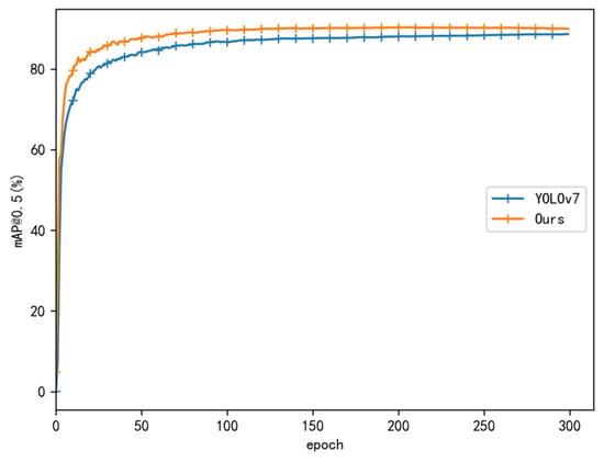 To demonstrate the improvement effect of the proposed method on the YOLOv7 network more intuitively, a comparison between the improved YOLOv7 network and the original YOLOv7 network in terms of the training results is presented in Figure 10 and Figure 11. Figure 10a,b depicts the precision-recall (P-R) curves of the YOLOv7 network and the proposed method, respectively. These curves include the mean average precision (mAP) values for classes such as face, face_mask, mask, and all classes. The horizontal axis represents the recall, while the vertical axis represents the precision. Figure 11 illustrates the mAP comparison between the two networks. It is evident that both curves exhibit an upward trend with increasing training iterations, and they tend to stabilize at approximately 150 epochs of training. The improved YOLOv7 network outperformed the original YOLOv7 network in terms of accuracy, showing advantages in mask-wearing detection in complex environments.