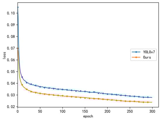 Figure 12 displays the convergence of the loss function for the original YOLOv7 network and the improved YOLOv7 network proposed in this paper. This comparison provides a visual representation, showing that the loss function values for the improved YOLOv7 network were consistently lower than those of the original network. Moreover, the improved network converged faster, indicating superior performance from the enhanced model.