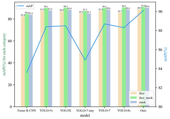 To quantitatively evaluate the performance of the improved model, this paper compares the improved model with Faster R-CNN, YOLOv5s, YOLOX, YOLOv7-tiny [30], the original YOLOv7 model, and the latest YOLOv8s model based on detection metrics. The comparative experimental results are shown in Figure 13 and Table 5. The mAP value of the improved model was higher than those of the other models, with a 6.5% improvement over Faster R-CNN, a 5.2% improvement over YOLOv7-tiny, and 1.7%, 1.6%, 1.4%, and 1.8% improvements over YOLOv5s, YOLOX, YOLOv7, and YOLOv8s, respectively. Compared with the original YOLOv7 model, the mAP values for each category were improved. Specifically, the mAP for faces without masks increased by 1.5%, that for faces with masks increased by 0.9%, and that for the mask category increased by 1.8%. Therefore, based on the comparison of mAP values, the detection performance of the improved model surpassed that of other mainstream detection models.