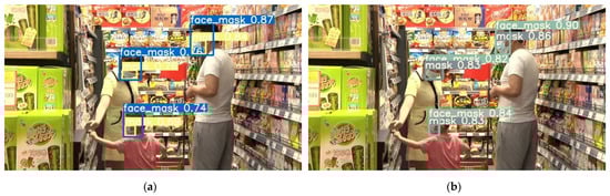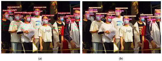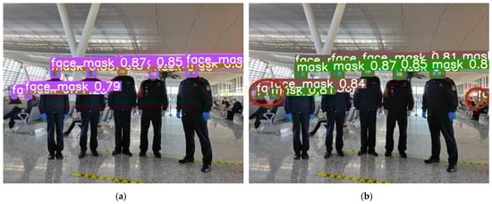 Figure 14a,b depicts a comparison of the detection results in complex environmental backgrounds. Compared with the YOLOv7 model, the proposed model in this paper demonstrated higher overall accuracy in detecting mask wearing in complex backgrounds.
