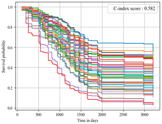 We used a Concordance Index (C-index) score to measure the performance of the model. The C-index is a performance metric used in survival analyses, which measures the degree of agreement between the relative order of events predicted by a model and the actual order in which they occur. The higher the C-index score, the better the model’s predictions [21,22]. We also measured the time-dependence area under the receiver operating characteristics (AUROC) by comparing the prediction of survival over time with the actual event occurrence. Analyses were performed by an independent investigator using scikit-survival 0.22.1. The AUROC and optimal thresholds were obtained by the multipleROC package in R. All reported p values are two-sided and considered statistically significant at <0.05. Statistical analyses were performed using R software/environment (R version 2.9.1).