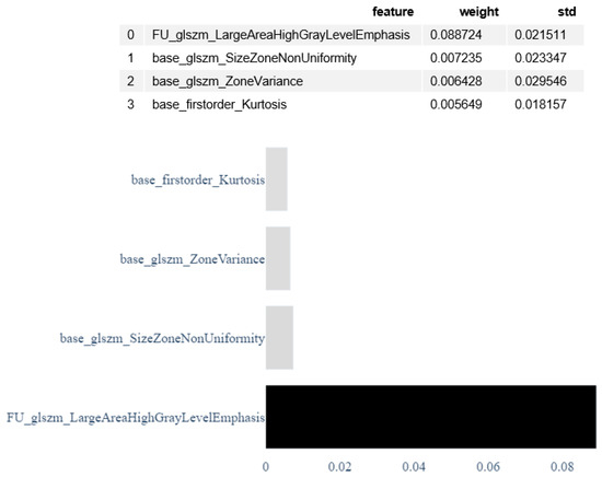 We compared 107 radiomics features between the baseline and follow-up data and analyzed 5 clinical characteristics (gender, age, tumor number, tumor size, and Child–Pugh score) as potential predictors of PFS and OS by the scikit-survival framework model, using the Random Forest Survival method. We calculated the C-index score to measure the performance of the model. The C-index was 0.582 (p = 0.020) as the graph of the cumulative hazard function, predicted by the variable configuration by using 112 features. (Figure 2). The time-dependent AUROC was 0.6 ± 0.06 (mean ± SD, p = 0.014) when comparing the prediction of survival over time with the actual event occurrence (Figure 3). Feature selection was performed based on the C-score of the model, and finally, four variables were extracted. The selected four variables were follow-up_glszm_LargeAreaHighGrayLevelEmphasis (weight 0.088), baseline_glszm_SizeZoneNonUniformity (weight 0.007), baseline_glszm_ZoneVariance (weight 0.006), baseline_firstorder_Kurtosis (weight 0.005) (Figure 4). We further determined whether the selected factors were good predictors of tumor response in HCC treated with TACE. According to mRECIST criteria, 33 patients (68%), achieved a CR and 15 (32%) had a PR, SD and PD. We then evaluated whether radiomics features and clinical factors perform optimally in the diagnosis of viable tumors. The AUROC of Baseline_glszm_SizeZoneNonUniformity, baseline_glszm_ZoneVariance and tumor size was 0.853 (p < 0.001), 0.814 (p < 0.001) and 0.827 (p < 0.001), respectively, and showed excellent performance as predictors of HCC response treated with TACE, while follow-up_glszm_LargeAreaHighGrayLevelEmphasis and kurtosis performed relatively well (AUROC, 0.812 (p < 0.001) and 0.681 (p < 0.001), respectively) (Figure 5).