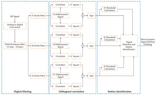 The detection of the Alpha navigation signal is the first step in signal processing in the receiving equipment, with the purpose being to find the starting position of the expected station of the three frequency signals [28]. To accurately identify the three frequency signals of each station in an Alpha navigation system under the influence of noise and mutual interference, this paper presents a multichannel orthogonal correlation method by which the recognition and signal detection of Alpha navigation stations can be realized. Figure 2 illustrates the implementation process of the proposed method. The proposed method is realized through three processes: digital filtering, orthogonal correlation, and station identification.