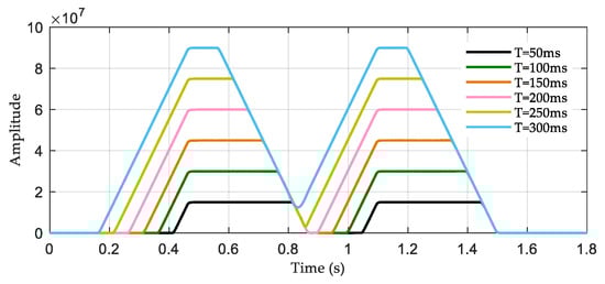 Mutual interference is the simultaneous reception of signals of different frequencies from different stations in an Alpha navigation system that interfere with the detection of the expected signal. When the expected detection signal and the mutual interference signal are received simultaneously, the mutual interference signal affects the waveform of the expected signal, which affects the amplitudes of the correlation peaks. According to the signal transmission time sequence of each station of the Alpha navigation system presented in Table 1, at most, three different frequency signals can be received simultaneously. Hence, when detecting the expected station, one or two mutual interference signals are received simultaneously. To comprehensively evaluate the detection ability of the proposed method under mutual interference, we analyzed the impact of one or two mutual interferences on the amplitude of the expected signal correlation peak. The range of the signal-to-interference ratio (SIR) between the expected signal and the interference signal is −28 dB to 10 dB.
