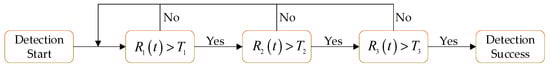 Station identification detects the expected stations based on the different transmission sequences of , , and , which are the frequency signals of the five stations of the Alpha navigation system. The specific goal was to detect the correlation peak by comparing the correlation results, namely , , and , of the three frequency signals with their corresponding thresholds. Figure 4 illustrates the station identification process.