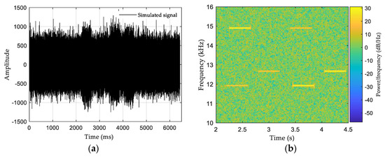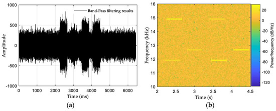 Signal after band-pass filtering. (a) Signal waveform. (b) Signal spectrogram.