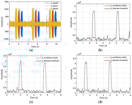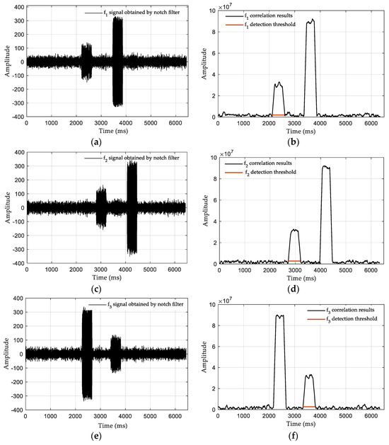 Figure 7 shows the signals extracted by the notch filters and the correlation results. The three frequency signals were separated by notch filters, and obvious correlation peaks were obtained via the orthogonal correlation method. Since the signal extracted by the notch filter is a continuous wave signal of three frequencies, multiple values will exist in the detection, resulting in increasing detection errors. In addition to not aliasing, the orthogonal correlation of different frequency signals has a unique correlation peak. According to the threshold calculation method and the detection conditions of the master station described in Section 2.2.3, the positions of the three frequency signals of the master station can be accurately detected, thereby proving the effectiveness of the proposed method.