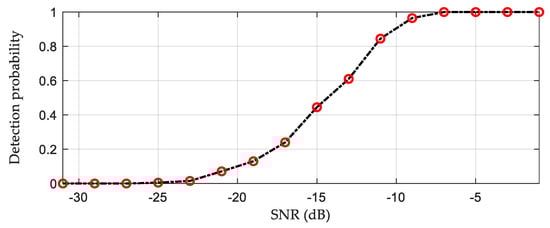 Figure 8 shows the signal detection probability under different SNRs. When the SNR is greater than −7 dB, the detection probability is 100%. Although the performance of the detection method decreases faster when the SNR is greater than −10 dB, the detection probability of the signal is exceeds 90%. Therefore, it is proven that the proposed method has good anti-noise performance. The proposed detection method can fulfill the requirement of Alpha navigation signal detection by receiver.