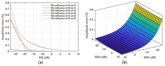 Figure 9a shows the proportion of the correlated peak amplitude errors caused by any pairwise comparison of , , and . Figure 9b shows the proportions of the correlated peak amplitude errors caused by the and frequency signals to the frequency signal. The proportion of the correlation peak errors caused by interference among the three frequencies is less than 0.8%. The ratio of correlation peak errors caused by both and is less than 0.6%. Generally, when the SIR exceeds −28 dB, the influence of mutual interference on the correlation results of the expected signal is less than 1% by using the detection method proposed in this paper. Therefore, it is shown that the proposed detection method can suppress mutual interference and reduce the influence of mutual interference on the correlation peak of the expected signal.