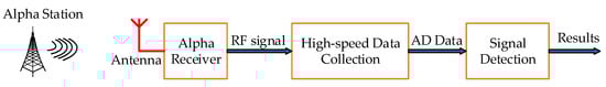 We tested the detection method by receiving an Alpha navigation signal in space. Figure 10 shows the testing scheme. A magnetic antenna was used to receive the Alpha signal in space, and the radio frequency (RF) signal was amplified using the Alpha receiver. We used a high-speed data collection board to obtain the Alpha navigation signal received by the antenna. The detection method proposed in this study was used to process the collected Alpha digital signal.