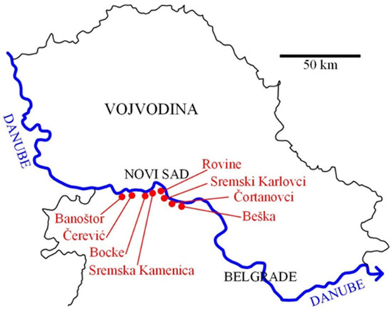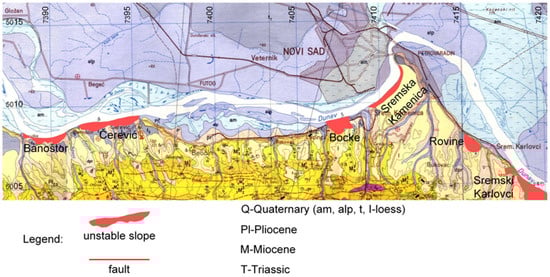 Landslides along the Danube, on the territory of Vojvodina (Serbia), occurred on the northern slopes of Fruška Gora Mountain. Fruška Gora is a low mountain in the Pannonia Plain. It is of elongated shape, with a length of approximately 40 km and a width of about 15 km. Its genesis is related to tectonic activities in the earth’s crust and the rise of its central area over relatively long faults. Fruška Gora is a horst-type mountain, and its large part has been declared a national park. Some researchers [1] hypothesized that the rise of fault blocks directly affects the activation of sliding processes. The whole area of Fruska Gora is intersected by streams. Its entire periphery is surrounded by smaller and larger settlements, including the city of Novi Sad. Landslides endanger significant infrastructural facilities, constraining the expansion of populated areas or endangering the stability of individually built structures. The most interesting thing about this is the Bocke landslide, with about 1000 vacation homes declared a part of Novi Sad in the previous period. There are a number of landslides formed on Fruška Gora, particularly on its northern slopes, which are generally inclined toward the Danube River [2,3]. A more detailed exploration of these landslides began in the middle of the last century. This was the time when the construction of railways and roads intensified, in some places, on the landslides.