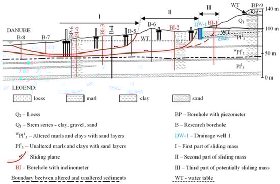 Sands and sandy clays dominate the Pliocene, while gravels and lignite are less common. The deeper facies consist of marls and marl clays. The middle Pliocene is represented by multicolored clays. Sands and gravels are present to a much lower extent. The upper Pliocene consists of yellowish sands, brownish sands, silts, and clays (Figure 2). Deep landslides along the Danube were formed in these Pliocene clays and sands. These sediments are slightly inclined toward the Danube at an angle of about 5°. The main causes of the landslides’ occurrence are sloping layers of clay and sand toward the Danube, groundwater in sands, erosion of the right river bank, thin layers of soft carbon clays, and altered Pliocene sediments by surface influences.