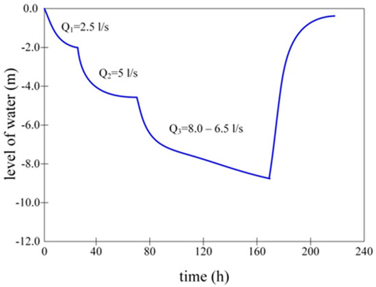 A drainage test was carried out after the construction of the wells and all the drains leading from them. Tests were performed by measuring the inflow from each of the drains both individually and together. During the test, levels of groundwater were measured using all of the installed piezometers. After the water level within the well stabilized due to the inflow of water from all the drains, test drainage was performed by pumping water from the well. Simultaneously, the levels of groundwater were measured using piezometers. The testing lasted approximately a month for each of the wells. Figure 5 shows the water level reduction in the DW-1 in three stages of the test drainage and the water level restoration in the well after the drainage ended.