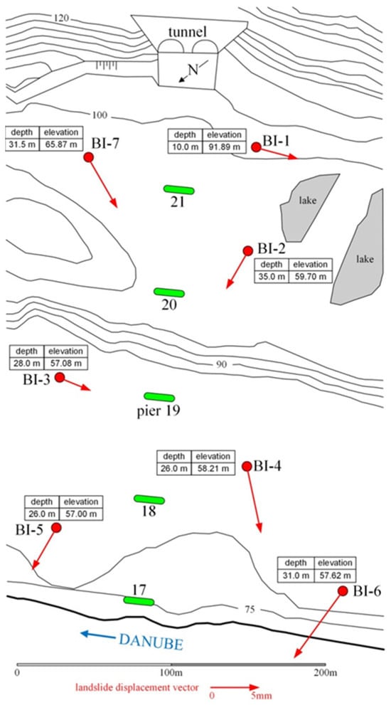 Multi-year measurements have been performed on seven inclinometers in the Sloboda bridge area. For each inclinometer, the average intensities of displacement vectors over one year are shown (Figure 6). The displacement vectors show that some landslides move upstream, others downstream, and some toward the Danube. The displacement mechanism probably operates by a pattern according to which a displacement of the first deep landslide along the Danube would probably lead to a displacement of the next landslide on the slope. Figure 6 shows pillars 17, 18, 19, 20, and 21 of the bridge, which are on the landslide and also on the places of the inclinometers. The data on the depth and elevation of the deepest sliding plane are shown.