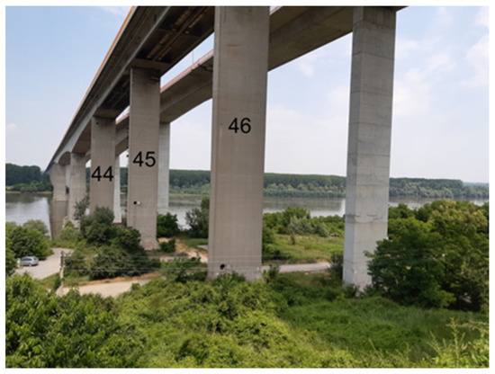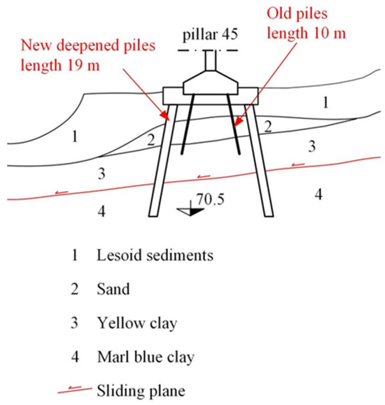 A large bridge on the Danube was built in the landslide zone of Beška. Despite the fact that the bridge was known to lie on a landslide (Figure 8), after its completion, serious problems arose, and the bridge had to be repaired immediately. The main recovery measures consisted of the production of deep piles. Part of the bridge near Beška, on the right bank of the Danube, has six pillars with 45 m to 60 m distance between them. Figure 9 shows only pillar site 45, lithological soil types in the zone of that pillar, originally constructed piles, and additionally constructed deepened piles as parts of the remediation. The deepened piles are finished in marl blue clay, middle 4, which forms a stable part of the terrain. Deepened piles were also made for pillars 44 and 46 (Figure 8). For pillar 45, 10 drilled piles with a diameter of D = 0.90 m were made, with the base of the piles at an elevation of 70.50 m. In addition to the fact that the rehabilitation envisaged and performed deepened the drilled piles to the required length, other rehabilitation measures were applied, such as drainage, making a stone bank revetment, reliefing, and landscaping in the bridge area.