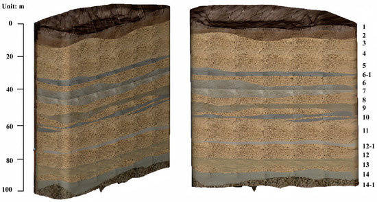 Based on the analysis of the geological survey results in the area of this section in the sub-center district, within the exploration depth of 107.00 m, the distribution characteristics of various soil layers are as follows: in the vertical direction, multiple sedimentary cycles of stable cohesive soil, silty soil, and sandy soil are observed; in the horizontal direction, there are certain variations in the thickness and soil characteristics of each layer. Specifically, it can be roughly divided into 17 layers, and the lithological combination characteristics at the exploration depth are detailed in Table 1 and Figure 2.