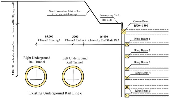 Currently, the intercity joint end well and the core area foundation pit are both located north of the existing M6 line, with the nearest horizontal distance of 16.43 m from the joint end well foundation pit. The existing Metro Line M6 has a burial depth of 23.3 m in the project area, a tunneling section radius of 3 m, a segment thickness of 0.35 m, and a spacing of 15 m between the right and left tunnel lines. The specific relationship between the foundation pit and the profile position of the M6 line is detailed in Figure 3. The construction of the intercity joint end well foundation pit and some of the core area foundation pits intrude into the control protection zone of the existing Metro Line 6, and construction is carried out in stages and segments. External operations have a complex impact on the internal forces and deformations of the structures in the existing metro line section.