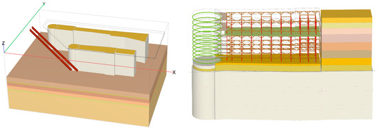 Based on the actual location of the site, a finite element model of the railway core area is established as shown in Figure 4, including the Jing-Tang junction well, the intercity junction well, the Jing-Tang core area, and the intercity core area. The radius of the well at the junction is 14.15 m, and the maximum excavation depth is 40.25 m. The maximum excavation depth of the core area well is 36 m. The retaining wall structure is generally irregular and is established according to the actual site location, with a maximum depth of 80 m. The existing operating Metro Line M6 tunnel is simulated using panel units, with a panel thickness of 0.35 m and C40 concrete material. The closest horizontal distance from the tunnel to the Jing-Tang junction well excavation is 19.43 m, and the closest horizontal distance to the intercity junction well excavation is 16.43 m.