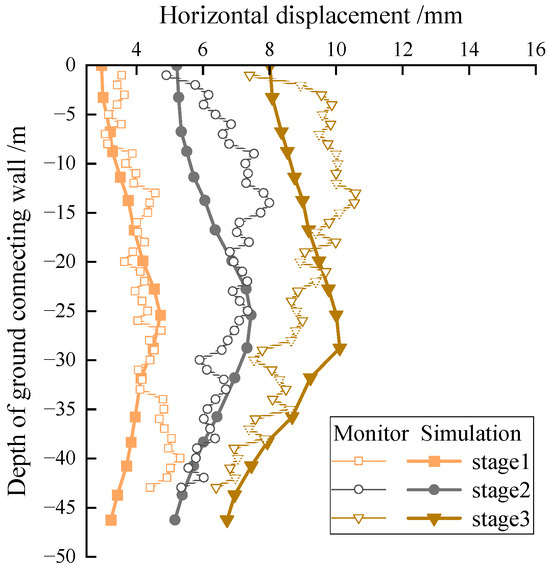 The horizontal displacement of the selected node varies with the depth of the connecting wall during excavation up to −18.75 m (stage 1), −27.75 m (stage 2), and −42.5 m (stage 9), as shown in Figure 6. The horizontal displacement of the diaphragm wall at each measurement point increases to a maximum value with the increase in the burial depth of the diaphragm wall, and then gradually decreases. From the comparison of on-site measurement and the simulation calculation of horizontal displacement, it can be seen that the simulation results of this study can better describe the variation law of on-site measurement results, and the magnitude level of the obtained displacement is not significantly different. Overall, the finite element method of the HSS model used in this article can better reflect the effect of soil excavation on structural deformation, and is suitable for the simulation and analysis of ultra-deep foundation pit excavation in the site.