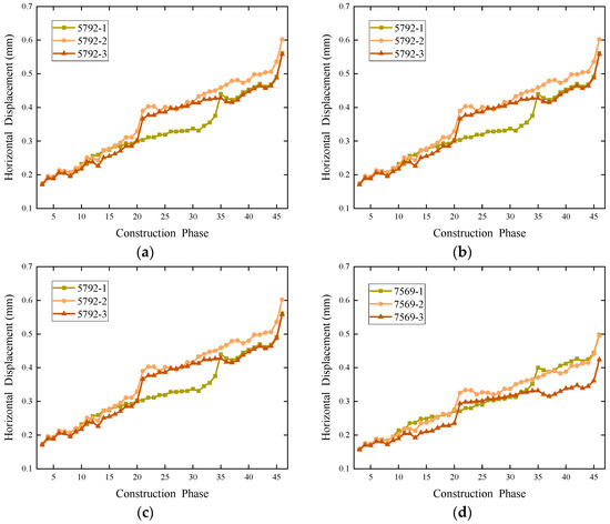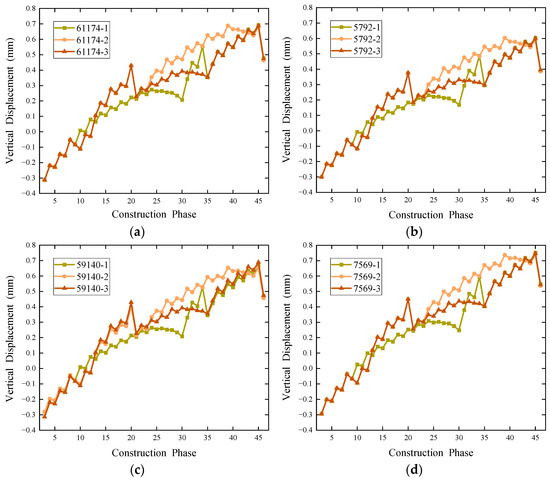 The vertical displacement variations of four points, namely, the horizontal direction nodes N61174 (near end) and N59140 (far end) and the vertical direction nodes N5792 (upper end) and N7569 (lower end), in the circumferential cross-section under the three different excavation sequence plans are plotted in Figure 11. Since the existing railway tunnel has been completed during the actual excavation (Plan 1), and the soil removal process (Plan 2) has been finished, these two conditions are set to have zero displacement in the numerical software. The numerical analysis only considers the phase starting from diaphragm wall construction (Plan 3), corresponding to the actual construction conditions.