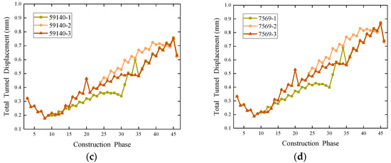 Overall, the trends in the total displacement of the selected cross-section changes align with those of vertical displacement, indicating that total displacement changes are predominantly driven by vertical displacements, with a relatively minor influence from horizontal displacements. This observation emphasizes the crucial impact of vertical displacement (uplift). At the beginning of the construction period, total displacements exhibit a decreasing trend, attributed to the higher density of the diaphragm wall compared to the original soil. The construction of the diaphragm wall induces a significant displacement in the surrounding strata, resulting in an initially large value for total displacement, primarily manifested as vertical settlement.