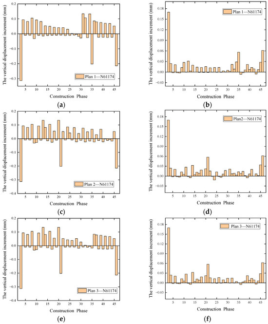 The incremental displacements under various conditions for the three plans are illustrated in Figure 15, taking the maximum displacement node N61174 as an example. The incremental displacement graph includes both vertical and horizontal displacement increments. Observing the figure, it is apparent that the vertical displacement increments and horizontal displacement increments resulting from the same condition differ by nearly an order of magnitude, with similar values for each displacement increment under all plans.