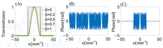 As shown in Figure 1A, when , the Tukey window is an ideal low-pass filter (rectangular window). When , the edge portion of the Tukey window becomes smoother as increases, and it still has multiple points at its top equal to 1. When is equal to 1, the non-zero portion of the Tukey window resembles a Gaussian low-pass filter. When comparing Figure 1B,C, it can be seen that after the transfer function of the D-FFT algorithm is filtered by the Tukey window (), its under-sampling parts are completely filtered out. At the same time, the ringing effect can be suppressed because the Tukey window has smooth edges.