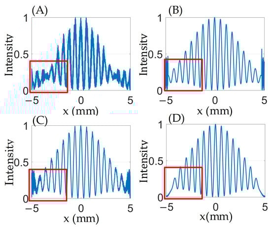 Intensity profiles through center of Young’s double-hole experiment fringes obtained by D-FFT (Tukey): (A) ; (B) ; (C) ; (D) .