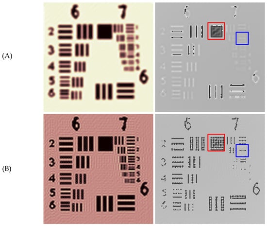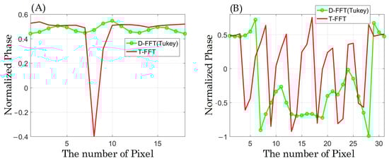 As shown in Figure 6A, in the phase reconstructed by the D-FFT algorithm, all three fringes in group 7, element 2 of USAF1951 can be resolved, whereas in the phase reconstructed by the T-FFT algorithm, there is a severe distortion at this location and only the centrally located fringe can be resolved. According to the profile line shown in Figure 6B, the phase distribution inside the rectangular hole obtained by the T-FFT algorithm has serious oscillations, which cannot distinguish the rectangular hole from the fringe effectively, while the D-FFT (Tukey) algorithm can distinguish the fringe from the rectangular hole in the same situation. Although the phase inside the rectangular hole obtained by the D-FFT (Tukey) algorithm still has oscillations, it does not affect the recognition of the rectangular hole. That is to say, DFFT (Tukey) is capable of obtaining more accurate and higher-resolution phase distributions than T-FFT.