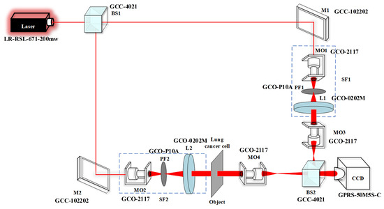 As shown in Figure 7, a laser with a wavelength of 671 nm is passed through a beam-splitter prism (BS1) and divided into object light and reference light. The beam on the reference side is reflected by reflecting mirror M1 and expanded by a 20-times microscope objective (MO1), then filtered into a spherical wave by a pinhole filter (PF1) with a diameter of 10 μm, and passed through a Fourier lens (L1) with a focal length of 300 mm, where the beam is transformed into a plane wave. The plane wave then enters the microscope objective MO3 and is reflected to the CCD through the beam-splitter prism BS2. The objective side of the microscope objective MO3 has the same parameters as that of the microscope objective MO4 in order to compensate for the phase difference caused by MO4. The other light is used as the object light, passed through a beam spatial filter (SF2) with the same parameters as the SF on the reference light side, and then converted into a plane wave to irradiate the lung cancer cell sections. The object light carrying information about the lung cancer cells is imaged by a 20-times microscope objective (MO4) with a distance of 246 mm from the imaging plane to the CCD.