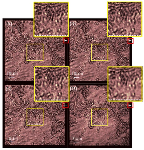 As shown in Figure 9A–C, there are oscillations in the reconstruction amplitude of the D-FFT, T-FFT, and T-FFT (rect) algorithms. Taking the image in the yellow box as an example, the existence of the oscillation phenomenon leads to an image background that is not smooth, and the lung cancer cell boundaries are presented as jagged-like boundaries. The oscillation phenomenon at the image background of the reconstructed image of D-FFT (Tukey) shown in Figure 9D is well suppressed, and the edges of the lung cancer cells are smoother.