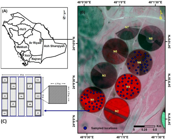 This study was conducted on three carrot fields irrigated with a center-pivot system (Fields’ IDs: N1, N4, and N6), each with an area of 27 hectares, belonging to the Tawdeehiya Farms located between the cities of Al-Kharj and Haradh in Saudi Arabia. This farm has an area of approximately 7000 ha and is located within an arid climatic zone between the latitudes of 24°10′22.77″ and 24°12′37.25″ N and the longitudes of 47°56′14.60″ and 48°05′08.56″ E (Figure 1). Sandy loam soil was the dominant soil type in the farm, where the main crops grown during the study period included a group of vegetables, the most important of which was the carrot crop. The mean annual temperatures in the experimental site ranged between 12 °C and 42 °C in the winter and summer seasons, respectively. The mean annual rainfall was about 98 mm, distributed mainly in the period between November and February. Tawdeehiya Farm produces carrots commercially and has facilities for data collection and measurements for continuous monitoring and yield assessment.
