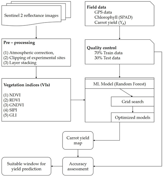 Satellite images with 10 m resolution are preferably suitable for data analysis and modeling agricultural studies such as decision-making, practicing sustainable agriculture, and execution of site-specific management practices in fields [49]. Freely available data from Sentinel-2 fulfill the requirements, as it has both the 20 m and 10 m resolution spectral bands. Therefore, level 2A cloud-free Sentinel-2 (sensors A and B) satellite images were downloaded from the datahub of the European Space Agency (https://dataspace.copernicus.eu/; accessed on 9 February 2024). The downloaded S2 images were pre-processed and analyzed for surface reflectance using the SNAP software program (Ver. 3.4.1). Each band of processed images was resampled to 10 m pixel resolution. The individual bands (2, 3, 4, and 8A) and selected vegetation indices, VI (Table 2), were computed for the carrot crop monitoring and yield prediction employing the machine-learning (ML) algorithm such as random forest. As the study intended to predict carrot production, vegetation indices related to chlorophyll and vegetation analysis were incorporated for the modeling.