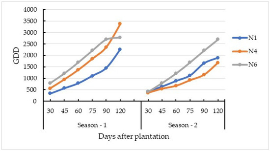 The accumulated GDDs of the tested carrot crops varied between 333 at the seedling stage to 3374 at root maturation (i.e., 120 DAP). The GDD was higher (43%) in season 1 compared to season 2 (Figure 3). Phenological growth stages of carrot plants were assigned based on the GDD as the seedling stage-SS (GDD ≤ 948), vegetative growth stage-VS (GDD = 948 to 1215), root development stage-RD (1216 < GDD > 2210), and root maturation-RM (GDD > 2210) stages.