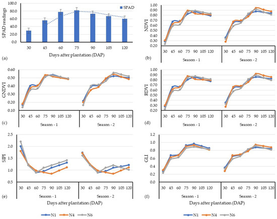 Temporal variation in SPAD readings (a) and vegetation indices derived from Sentinel-2 image (b–f) across the growth stages (i.e., days after plantation).