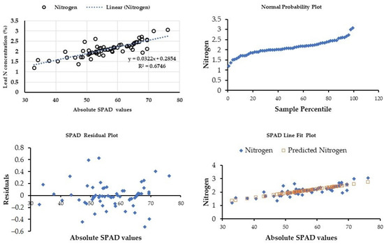 A regression analysis between SPAD values and leaf nitrogen content showed a consistent relationship (R2 = 0.68; p < 0.001) as given in Figure 5. The leaf nitrogen content and the relationship with the SPAD readings are in accordance with the study by [58]. However, there is a variation in the significance of the model with other studies. It is due to the continuous observation of the SPAD, and laboratory analysis of nitrogen compared to others. On the other hand, SPAD values and the greenness of the leaf are significantly correlated, alternately depending on the rate of fertilizer application.