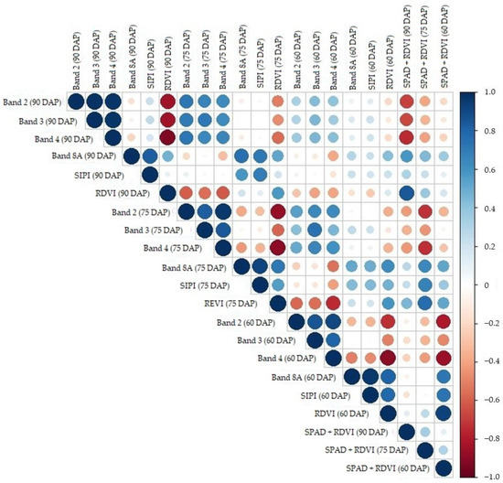 Single VI-based best-fit models were assessed and provided in Table 5. The relationship between the simulated ground-measured SPAD readings and studied VIs was found to be significant with GNDVI (R2 = 0.78; p < 0.001), while a weak relationship was noticed with GLI (R2 = 0.09; p < 0.05). The best-fit models are observed with the peak stage of carrot growth at 60 DAP to 70 DAP. The correlation was low with all the studied VI earlier than 45 DAP, while, during the later stage (i.e., 90 DAP onwards), the results expressed a moderate correlation with RDVI and SIPI (Table 5).