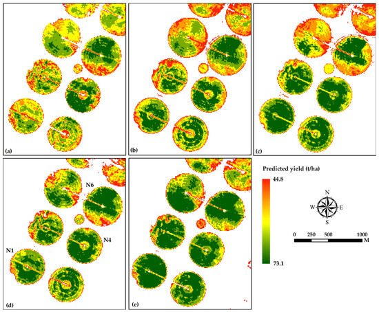 Predicted carrot yield maps generated using a random forest (RF) algorithm. (a) Sentinel-2 bands, (b) vegetation indices, (c) Sentinel-2 bands + SPAD values, (d) vegetation indices + SPAD values, and (e) Sentinel-2 bands + vegetation indices + SPAD values, as predictors in model development. The SPAD values used in the model were with the Pearson correlation coefficient (R2) > 70 with yield (YA).