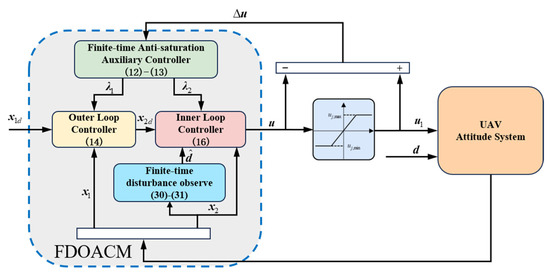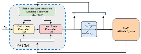 Therefore, the structure of the finite-time anti-saturation control method (FACM) for the quadrotor UAV attitude system is shown in Figure 1.